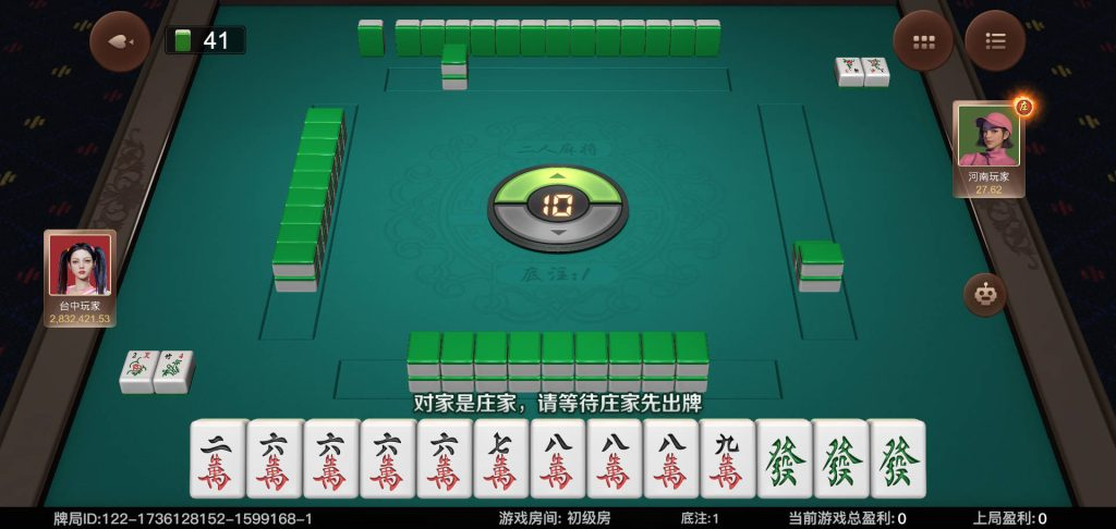 每局遊戲開始時,系統會隨機選擇一位玩家作為莊家。開局前,兩位玩家會投擲兩顆骰子,根據骰子的點數來決定抓牌的方式。首先,骰子的總和點數用於確定抓牌的方向,即選定東南西北四個方位中,從哪一側的牌牆抓牌。其次,骰子中點數較小的一顆用來確定抓牌時須跳過的墩數。如果兩顆骰子的點數相同,則可以選擇任意一顆骰子的點數作為參考。