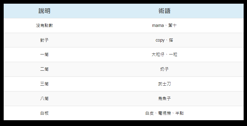 一筒代表1點,二筒代表2點,以此類推到九筒就代表9點,而白板則代表半點。