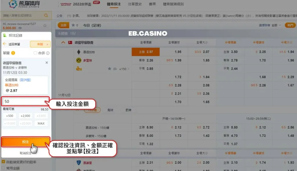 於左方【我的注單】會顯示您要投注的賽事及玩法,確認沒問題後輸入下注金額即立即投注