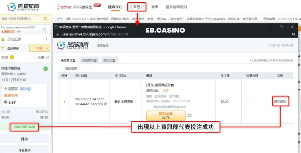 最後點進【注單歷史】可馬上確認是否投注成功!