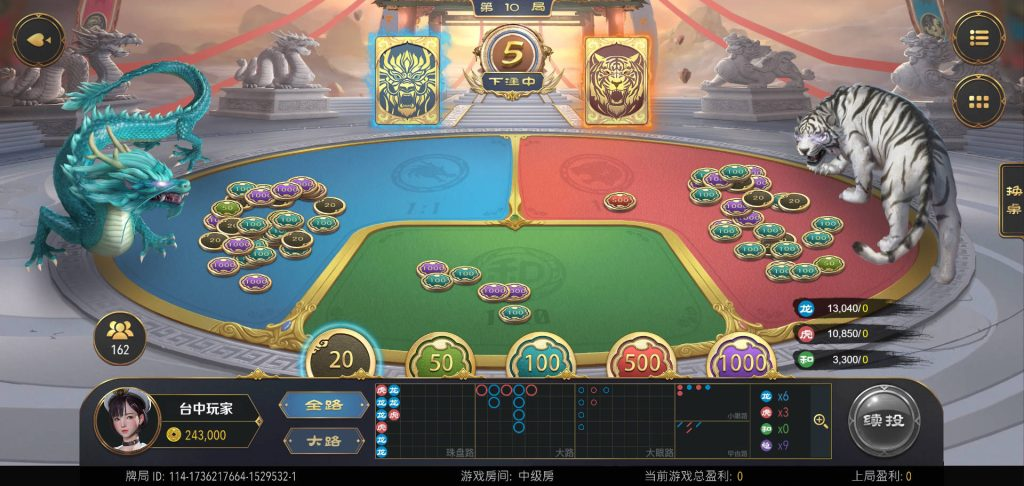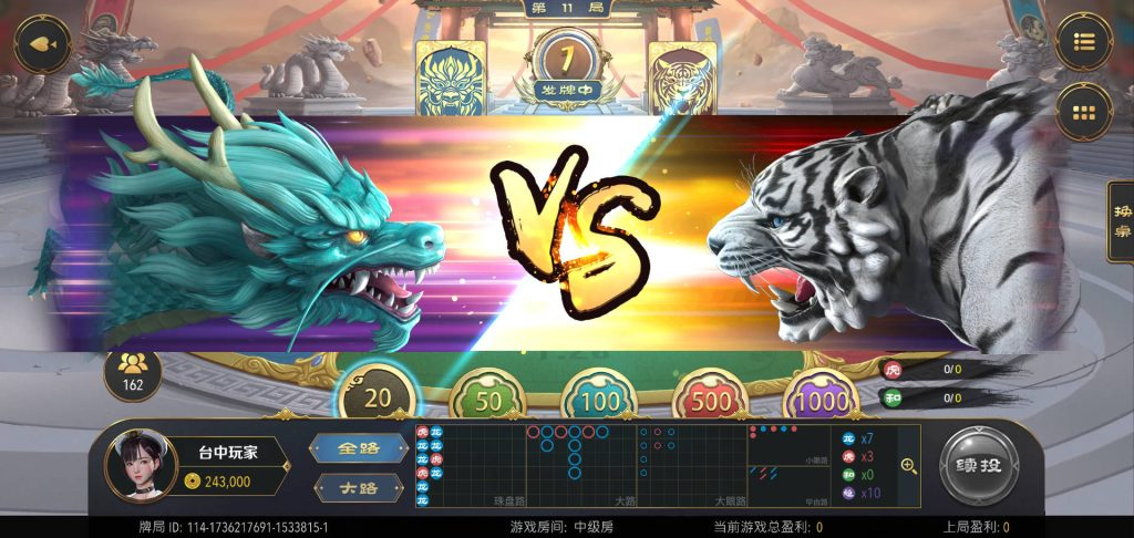 - 下注方式:玩家可在下注區選擇「龍」、「虎」或「和」進行投注。