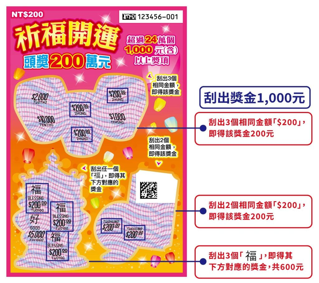 祈福開運8,160,000張200元34%114/10/03頭獎200萬元(6個)、10萬元(48個)、5萬元(616個)
