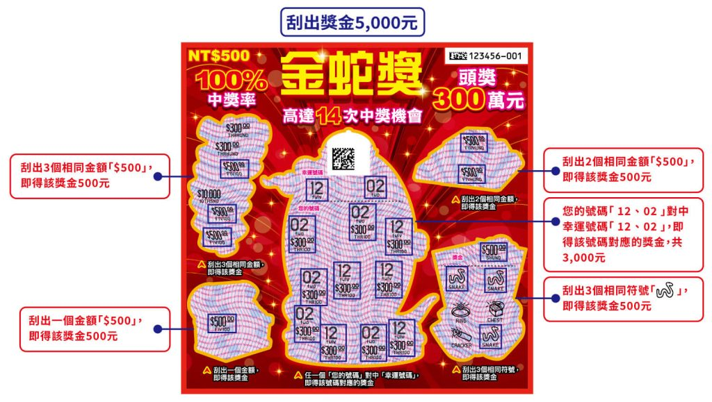 金蛇獎500元300萬元100%希望穩定中獎且喜歡多樣化玩法的玩家100%中獎率,適合想體驗中獎樂趣的玩家。