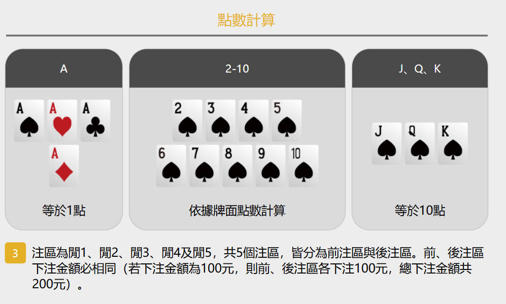 • 點數:3張牌相加取個位數,例如2+9+8=19,取9點;2+3+5=10,取0點。