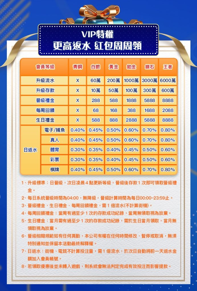 • 升級與返水規範:升級後,會員需完成相應的流水要求,才能獲得晉級禮金與每周回饋。若未達成有效投注要求,系統可能無法認定為有效投注,並影響提款。
